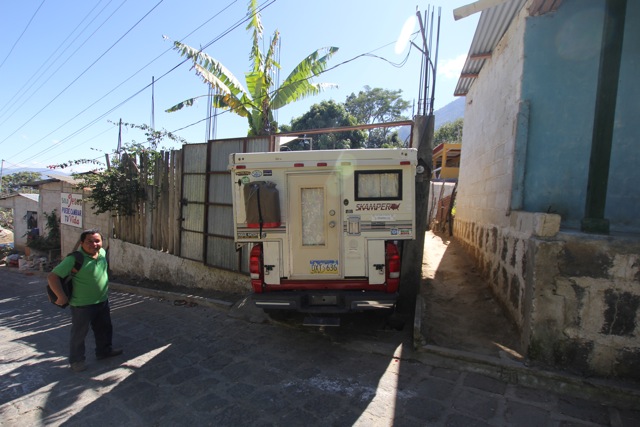 It turns out a 6 ½ foot wide camper, does not fit very well through a 6 ½ foot wide gate, especially when said gate is abutted by concrete pillars and off a typical narrow, steep Guatemalan road with no maneuvering room. Over the next hour and half, despite numerous though miniscule attempts to turn and squeeze her through, she was still stuck.