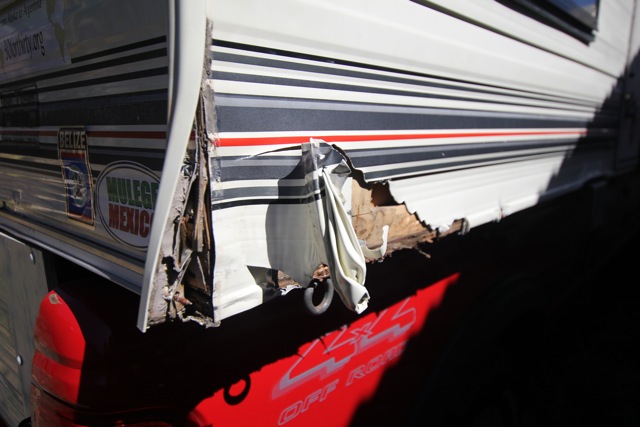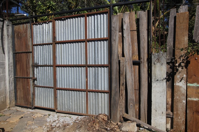 Byron had called for Guatemalan reinforcements, and was planning on demolishing the existing gate in order to get the truck in. The prospect of possibly inebriated (it was 12/21, a grande fiesta in San Pedro) Guatemalan’s swinging sledgehammers around Suzie was not acceptable. With some muscle power, a bit of rocking, and the sound of screeching metal, ‘POP’ she was in. A quick assessment of the damage revealed torn tin on the back right corner of the camper and a broken roof clip.