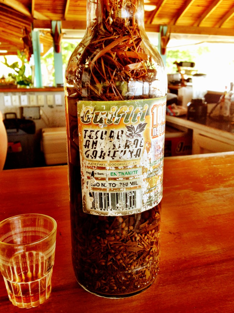 The bottle looked innocent enough, merely herbs floating in a clear liquid. Taking four shots in a row should be as easy. Not easy when the four shots are part of the Guifiti Challenge at the Skid Row Bar. Guifiti is a local moonshine primarily made on the northern coast of Honduras. It is not innocent. It is potent. Although recipes vary from town to town and even bar to bar, Guifiti is essentially aguardiente (local cheap booze) infused with a variety of herbs and spices. It is rumored to have aphrodisiac and medicinal properties as well as a very high alcohol content. During our two weeks on the Bay Island of Utila, we were able to closely study the effects of Guifiti on young European tourists, and although we cannot speak to the aphrodisiac effects, we can attest to its ability to enhance, impair, and otherwise debilitate and based on our observations recommend that no one in a normal state of mind should take four shots in a row.